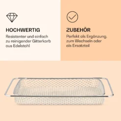 Der Gitterkorb der Klarstein AeroVital Chef Cube Heißluftfritteuse eignet sich hervorragend zur Zubereitung von großem und kleinem Frittiergut wie Chicken Wings oder Kroketten. Das engmaschige Gitter sorg dafür, dass auch kleine Speisestücke nicht durch das Gitter fallen und die Heißluft dein Essen von allen Seiten gleichmäßig frittiert. Durch die Fertigung aus Edelstahl ist der Korb besonders resistent und lässt sich leicht reinigen.