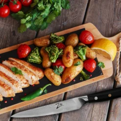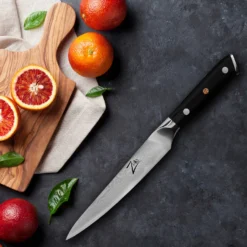 Allzeit bereit: In einer modernen Küche darf ein praktisches Allzweckmesser nicht fehlen. Da ist das 6″ Allzweckmesser der exquisite Generalist der Infinity by Klarstein Alpha-Royal Japanese Serie. Wo ein Messer zu groß fürs Entkernen von Gemüse, wiederum ein anderes zu klein zum Zerteilen von Obst oder Fleisch ist – dort findet das windige Universalmesser seine Passion. Dank hervorragender Schnitthaltigkeit hinterlässt es besonders feines Schnittgut, dabei haftet dank dem Klingenfinish nichts am Messer. So ist das vielseitig einsetzbare Qualitätsmesser stark beim Zerteilen von Mangos oder Grapefruits, Schneiden von Zucchinis, Würfeln von Fleisch oder auch beim Kartoffelschälen.