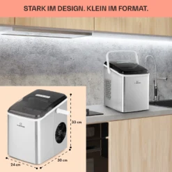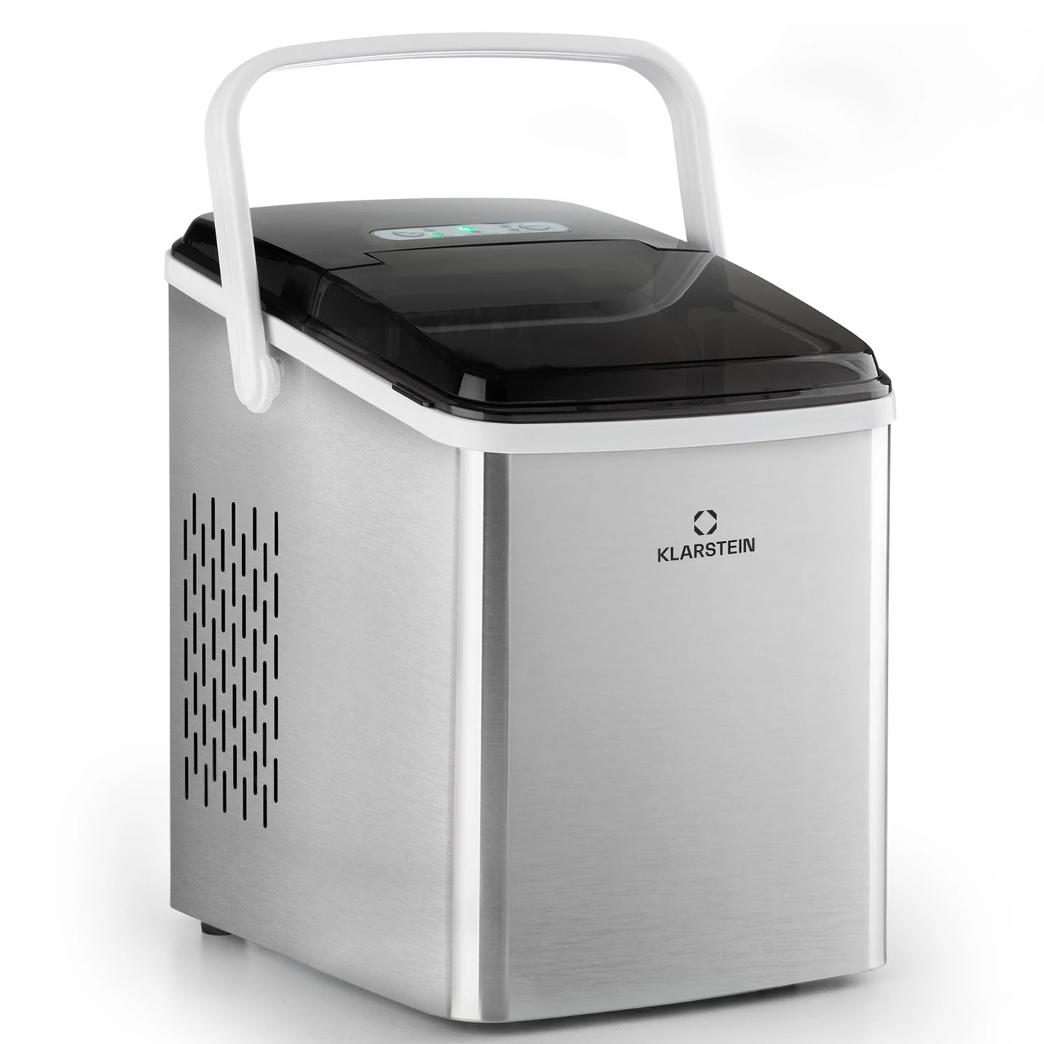 Die leistungsstarke Arctic Porter Eiswürfelmaschine stellt am Tag bis zu 12 kg Bullet-Eis her und ist hervorragend für den Einsatz auf allen Partys sowie in Gaststätten oder Bars geeignet. Auch für den normalen Heimgebrauch ist die Arctic Porter ein echter Gewinn: Mit ihr stehen zuhause immer frische Eiswürfel zum Kühlen von Drinks bereit. Abhängig von der eingestellten Größe S oder L werden 9 Eiswürfel in einem Zyklus von 8 Minuten bereitgestellt. Im Fall eines leeren Wassertanks oder eines vollen Eiswürfelbehälters geben Kontrollleuchten am übersichtlichen Touch-Bedienfeld des Eiswürfelbereiters zuverlässig Auskunft. Und wer gern alles im Blick behält, kann durch das große Sichtfenster den Füllstand genau in Augenschein nehmen, ohne den Kühlbehälter zu öffnen. Besonders praktisch ist der große Tragegriff mit dem sich der Eiswürfelbereiter zum mobilen Erfrischungskünstler verwandelt. Nach Gebrauch lässt sich der Arctic Porter dank Selbstreinigungsfunktion und einem glatten Gehäuse aus Edelstahl leicht reinigen. Das edle Finish fügt sich ideal in jedes Ambiente ein.