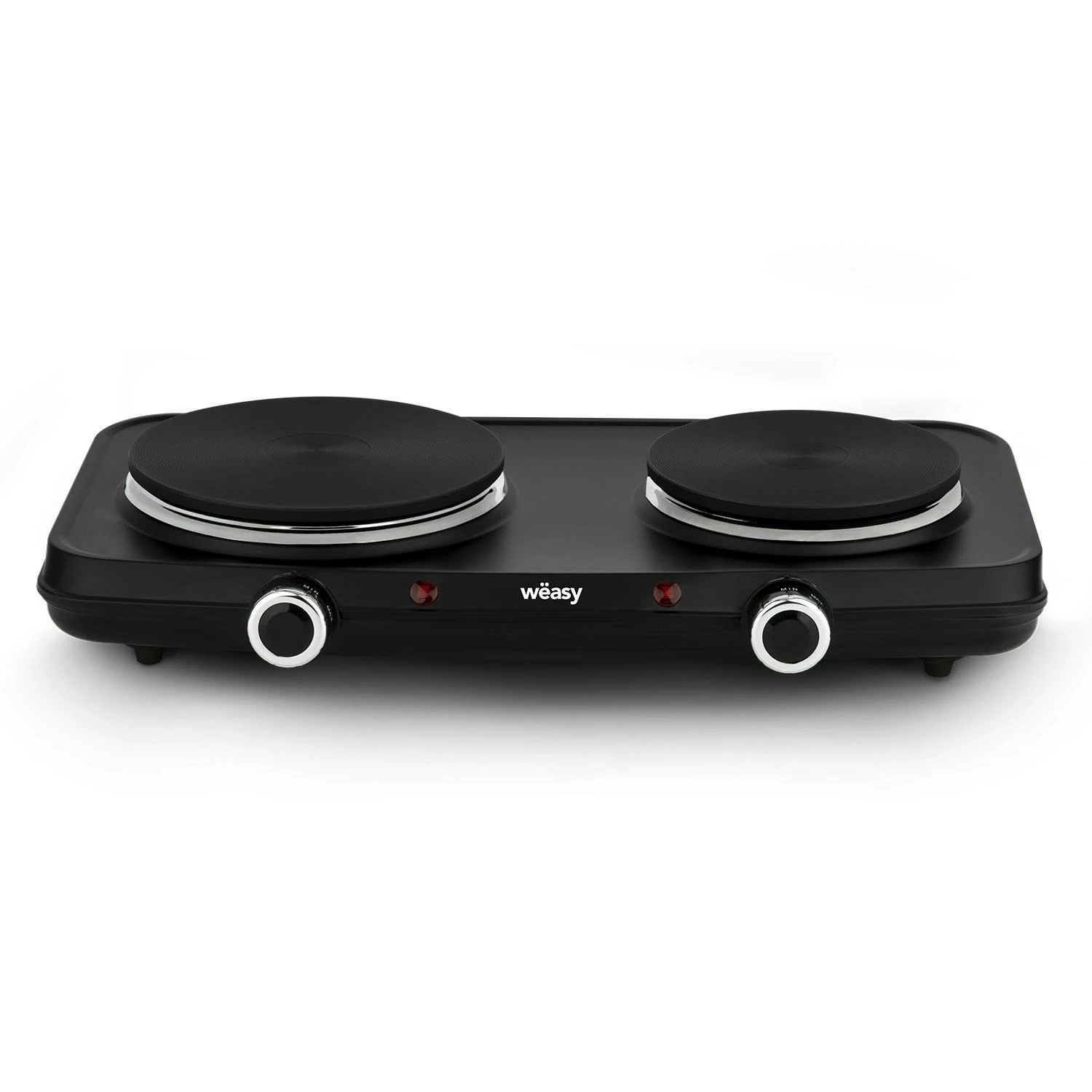Die Heizleistung der Klarstein Cookorama Doppelkochplatte kann bequem mittels drehbarem Thermostat mit 5 Heizstufen reguliert werden. So werden Eintöpfe, Suppen und Schmorgerichte stets auf Idealtemperatur gebracht und konstant erhitzt. Doch auch bissfestes Gemüse und saftige Steaks kommen minutengenau gekocht auf den Teller: Mit 2 Gusseisenplatten mit 150 sowie 180 mm Durchmesser und einer Leistung zwischen 1900 und 2250 Watt erhalten alle Gerichte die benötigte Hitzezufuhr und können ideal zubereitet werden. 2 Haltegriffe erleichtern darüber hinaus den einfachen Transport, während 2 LED-Kontrollleuchten darüber Auskunft geben, welche Herdplatte momentan erhitzt wird.