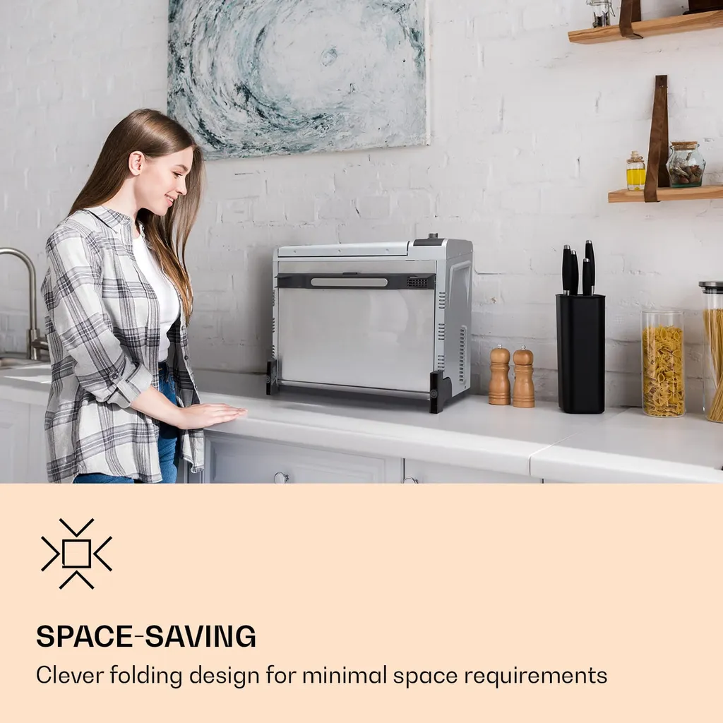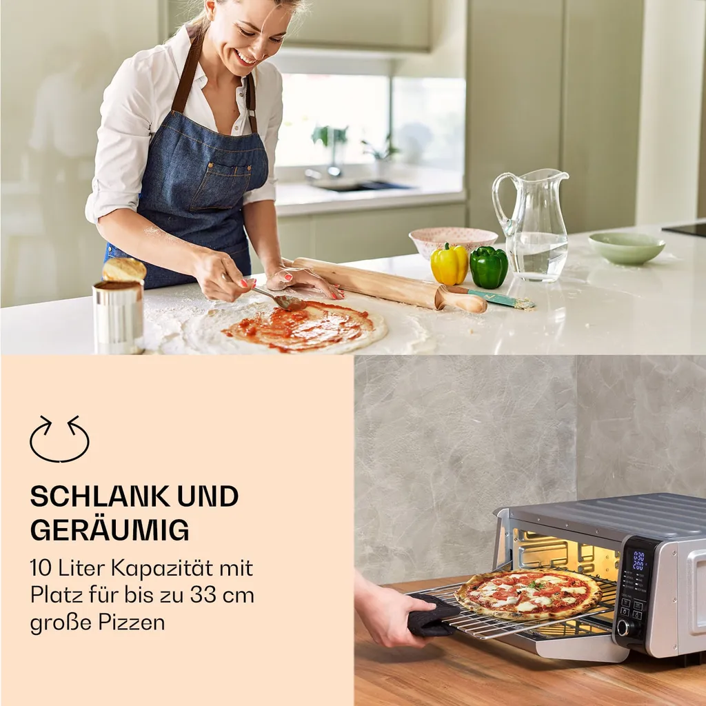 Die Klarstein Vita-Crisp Heißluftfritteuse Ist Ein Schlanker Alleskönner In Der Küche. Ihre 8 Unterschiedlichen Funktionen – Frittieren, Barten, Grillen, Dörren, Toasten, Backen, Warmhalten Und Pizza-Modus – Kannst Du Ganz Bequem über Das Frontseitige Display Mit Drehknopf Einstellen. Das Vierteilige Zubehör-Set Liefert Dir Alles, Was Du Für Heiße, Knusprige Snacks Brauchst. Dank Des Geräumigen Innenraums Wird Die Vita-Crisp Spielend Mit 33-cm-Pizzen Fertig. Die Reinigung Gestaltet Sich Dank Cle