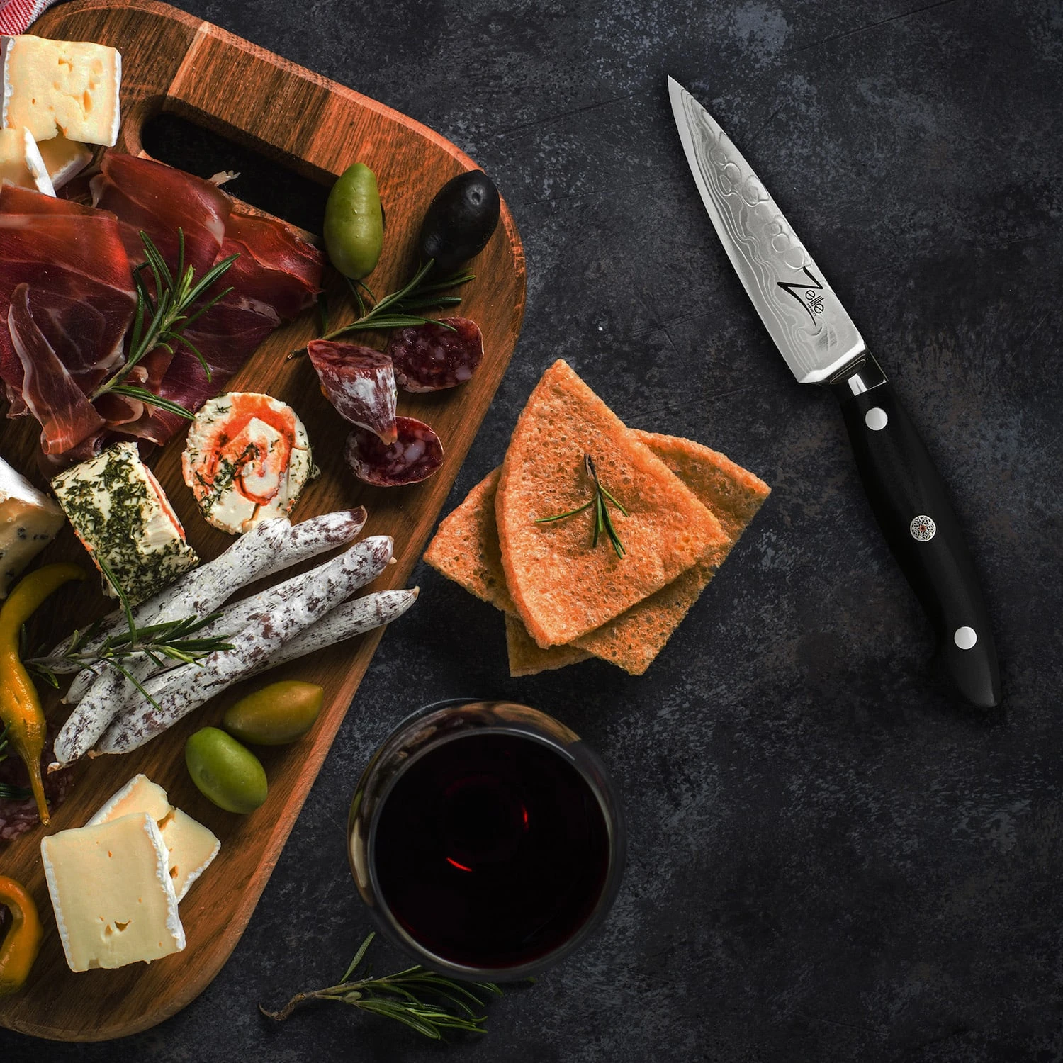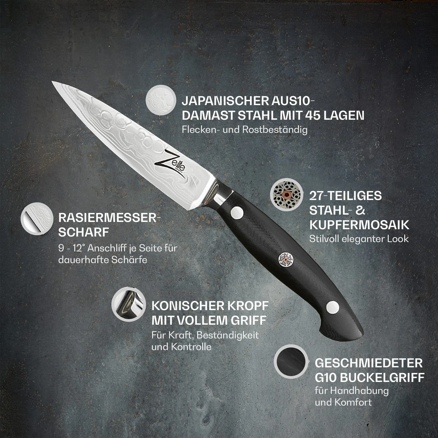 Unser Schälmesser der Executive-Plus Serie von Zelite Infinity by Klarstein besitzt eine 45-lagige Damastklinge und einen gebogenen Bauch. Mit diesem professionellen Werkzeug kannst du einfach schälen, entkernen, schneiden, würfeln und zerkleinern. Es hat die ideale Größe zum Entflechten von Garnelen, für Präzisionsarbeiten, zum Garnieren sowie Tournieren von Gemüse. Es ist klein und extrem wendig. Der ergonomische G10-Griff mit Buckelrücken fühlt sich an, als wäre er speziell für deine Hand angefertigt worden und macht die Arbeit auf oder neben dem Schneidebrett zum reinen Vergnügen.