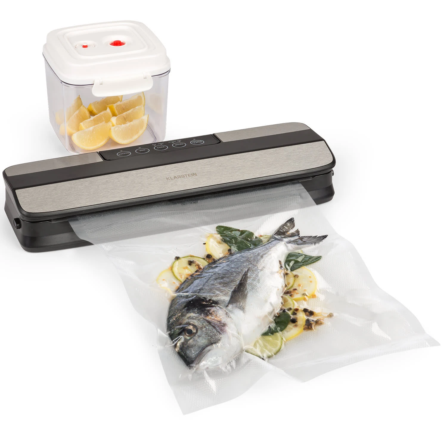 Schnelles Vakuumieren für lange Haltbarkeit: Mit dem Klarstein Forli Vakuumierer kannst du Lebensmittel in Sekundenschnelle luftdicht verschweißen und dadurch bis zu drei mal länger aufbewahren. Frische Kräuter, blanchiertes Gemüse und mariniertes Fleisch werden je nach Größe in Vakuumierbeuteln verpackt, vakuumiert, mit dem dazugehörigen Beutelschneider abgetrennt und versiegelt. Alternativ lassen sich Lebensmittel auch mit Hilfe des beigelegten Vakuumierschlauchs luftdicht im 1,4 Liter fassenden Vakuumierbehälter lagern. Mit Einstellungen für den Trocken- oder Feuchtmodus sowie für eine normale oder abgeschwächte Vakuumierung ist der Forli Vakuumierer von Klarstein ein wahres Allround-Gerät: Er wird den Haltbarkeits-Anforderungen verschiedenster Lebensmittel gerecht, kann für die Vakuumierung zur Aufbewahrung von Reiseutensilien verwendet werden und darüber hinaus Wein in externen Behältern und Flaschen vakuumieren.