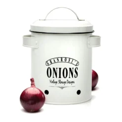 Die Georgia Vintage-Vorratsbehälter verleihen deiner Küche das gewisse Etwas und sind eine Bereicherung für jeden Haushalt: Bestehend aus insgesamt 3 x Klarstein Vorratsdosen für Knoblauch (12 x 18 cm (ØxH)), Zwiebeln (17 x 22,5 x 14 cm (BxHxT)) und Kartoffeln (27 x 21 x 23,5 cm (BxHxT)).
