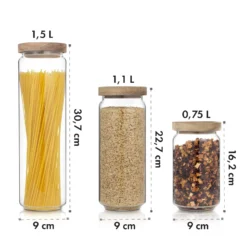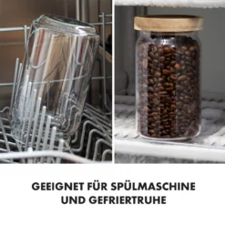 Die Aufbewahrungsgläser sind aus beständigem und bruchsicherem Borosilikatglas gefertigt, besonders hitze- und kälteresistent und dabei federleicht. Der BPA-freie Silikonring sorgt in Kombination mit dem praktischen Akazienholzdeckel für 100 % Dichtigkeit und Aromaschutz. Mit 0,75, 1,1 und 1,5 Litern Volumen bieten die Klarstein Glaswerk Lovage Vorratsgläser großzügig allerlei Vorräten Platz. Die durchsichtigen Behälter sind der ideale Aufbewahrungsort für Nudeln, Kaffeebohnen, Mehl, Zucker oder Müsli. Dabei sind sie nicht nur ein echter Hingucker in deinem Küchenregal, durch die Form der Deckel lassen sich die Gläser auch platzsparend stapeln.