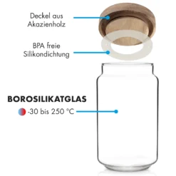 - Material: Borosilikatglas, Akazienholz, Silikon