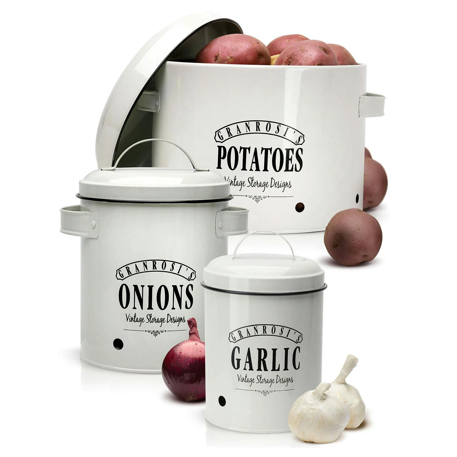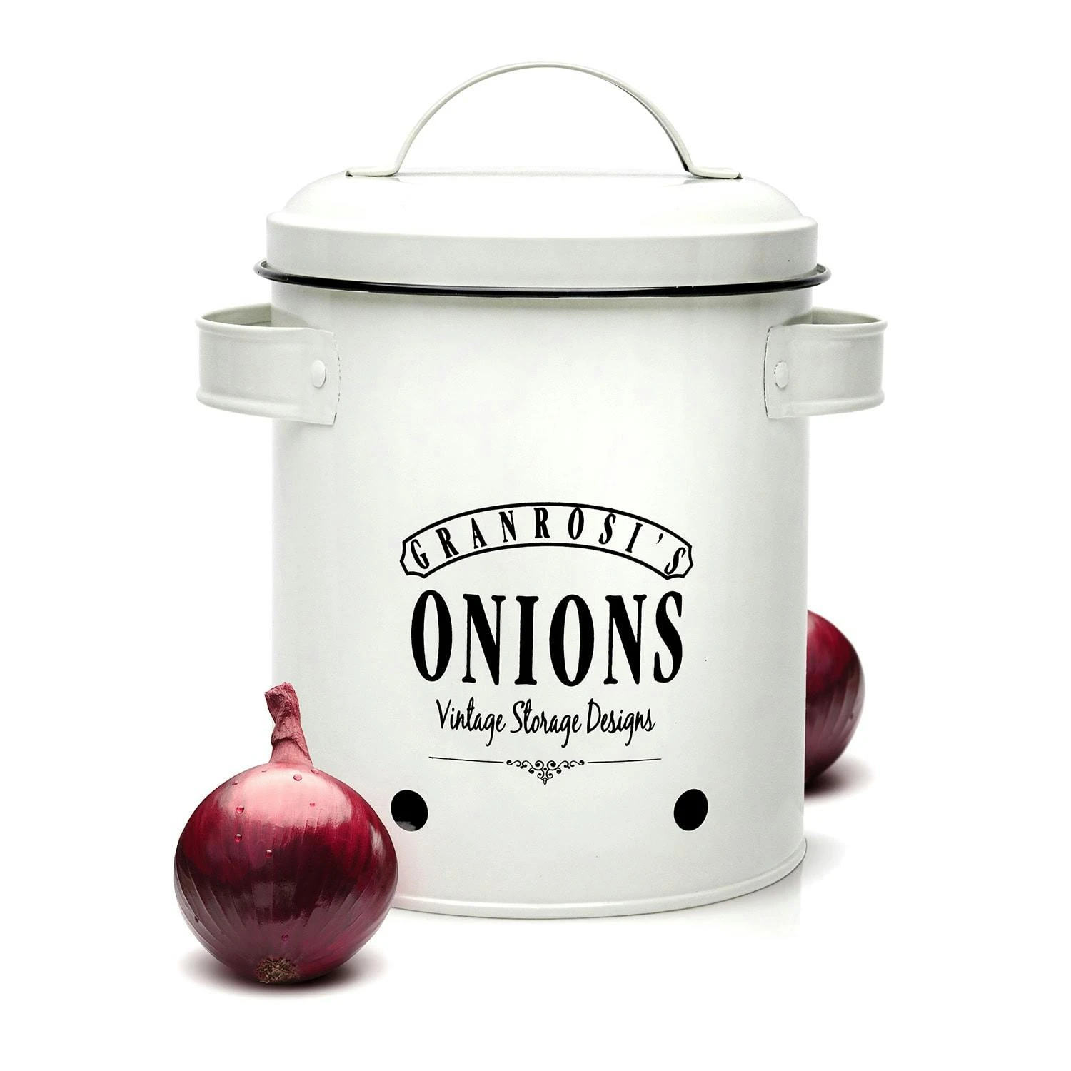 Der platzsparende Emaille-Kartoffeltopf von Klarsteinim Vintage-Design der 40er Jahre mit der Aufschrift „POTATOES“ ist nicht nur sehr stabil und groß genug für die Kartoffellagerung von ca. 1,6 kg, sondern auch ein absoluter Blickfang in jeder Küche. Was oft vergessen wird: Kartoffeln sind vor allem dann lange haltbar, wenn sie dunkel und bei leichter Luftzirkulation gelagert werden. Durch die kleinen Lüftungslöcher im Kartoffelbehälter wird die Keimbildung verhindert und die Kartoffeln bleiben länger frisch. Die Aufbewahrungsbox kann selbstverständlich auch für die Lagerung von anderem Gemüse verwendet werden und lässt sich schnell und einfach mit einem feuchten Tuch reinigen. Mit Maßen von ca. 27 x 21 x 23,5 cm (BxHxT) passt dieses Kartoffellager im Landhaus-Stil bequem auf dein Sideboard, deine Küchenzeile oder in den Küchenschrank. Das stabile rostfreie Emaille-Stahlblech ist sehr robust und kann – anders als Steingut oder Porzellanbehälter – den ein oder anderen unabsichtlichen Sturz überstehen.