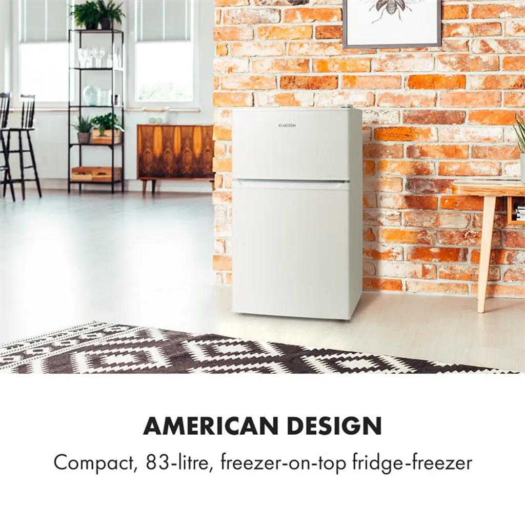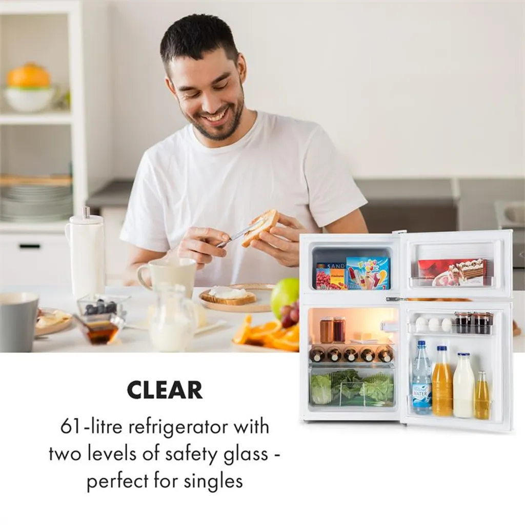 Klarstein Big Daddy Cool Kühl-Gefrier-Kombination , Fassungsvermögen: 87 Liter , Kühlschrank: 61 Liter , Gefrierschrank: 26 Liter , 2 Ebenen , Freezer-on-Top , Crisper-Fach Für Gemüse , Flaschenfach Bis 2 Liter , Weiß