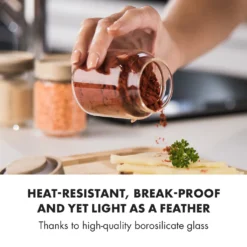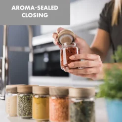 Klarstein Glaswerk Cassia Gewürzgläser Vorratsgläser Gewürzgläserset , 6 X 130 Ml , Borosilikatglas , Deckel Aus Akazienholz , Stapelbares Design , Luftdichte Aufbewahrung