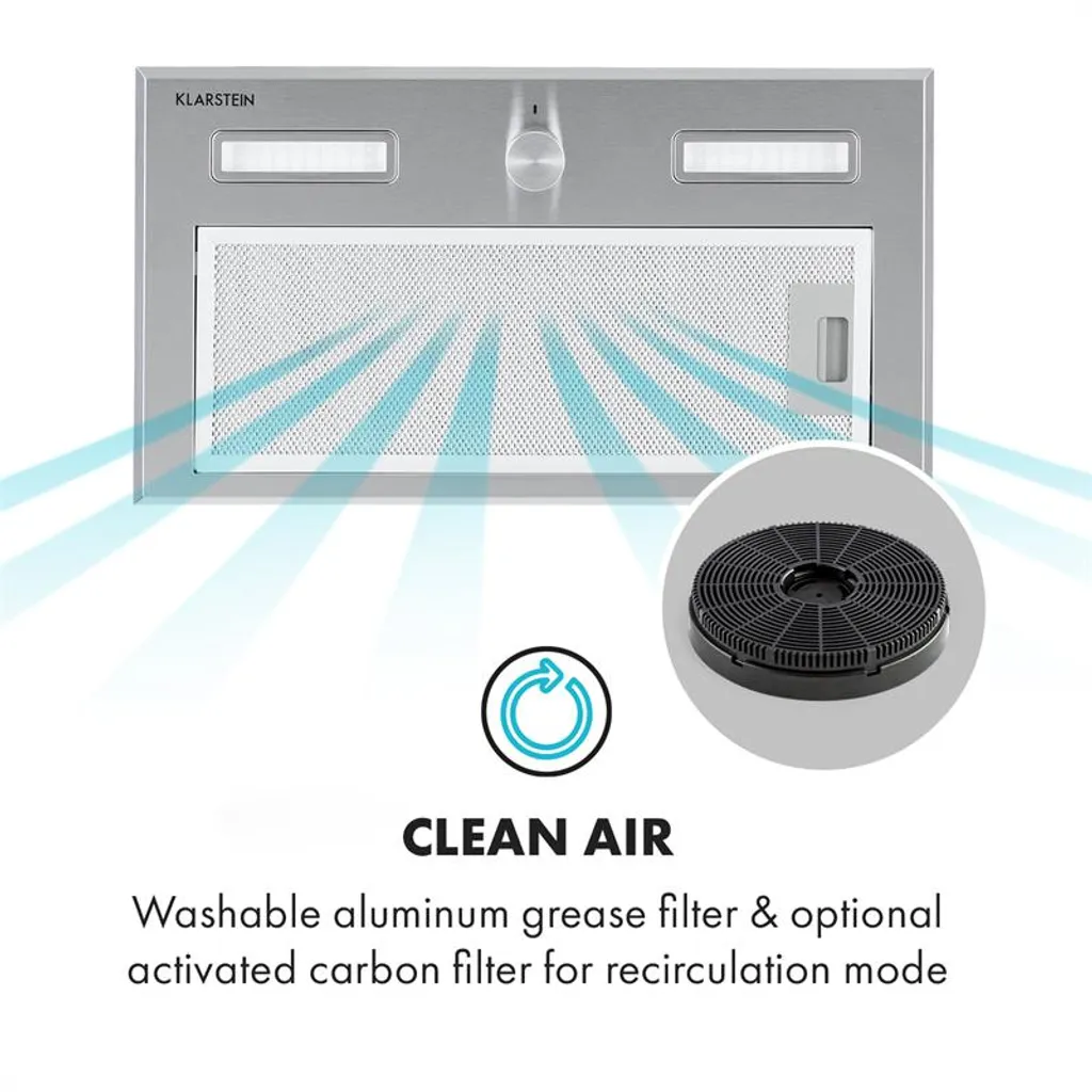 Klarstein Simplica 52 Lüfterbaustein ,Einbauhaube ,52 Cm Breit ,Abluftleistung: 400 M³/h ,Umluftbetrieb Möglich ,Drehknopf ,3 Stufen ,LED-Beleuchtung: 2 X 1,5 W ,Dunstabzugshaube ,Edelstahl