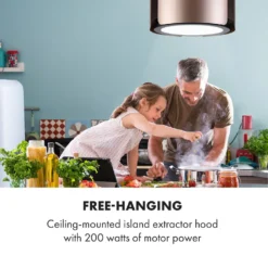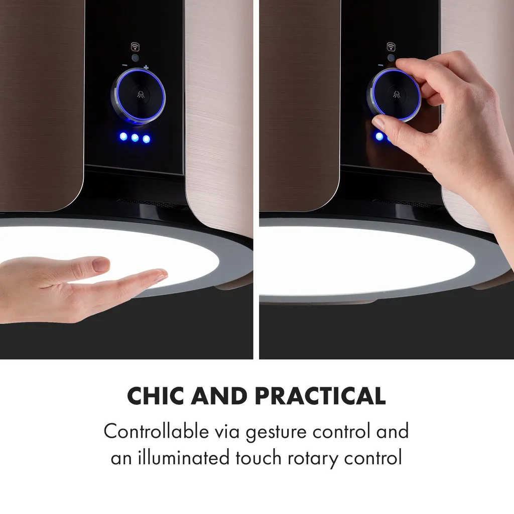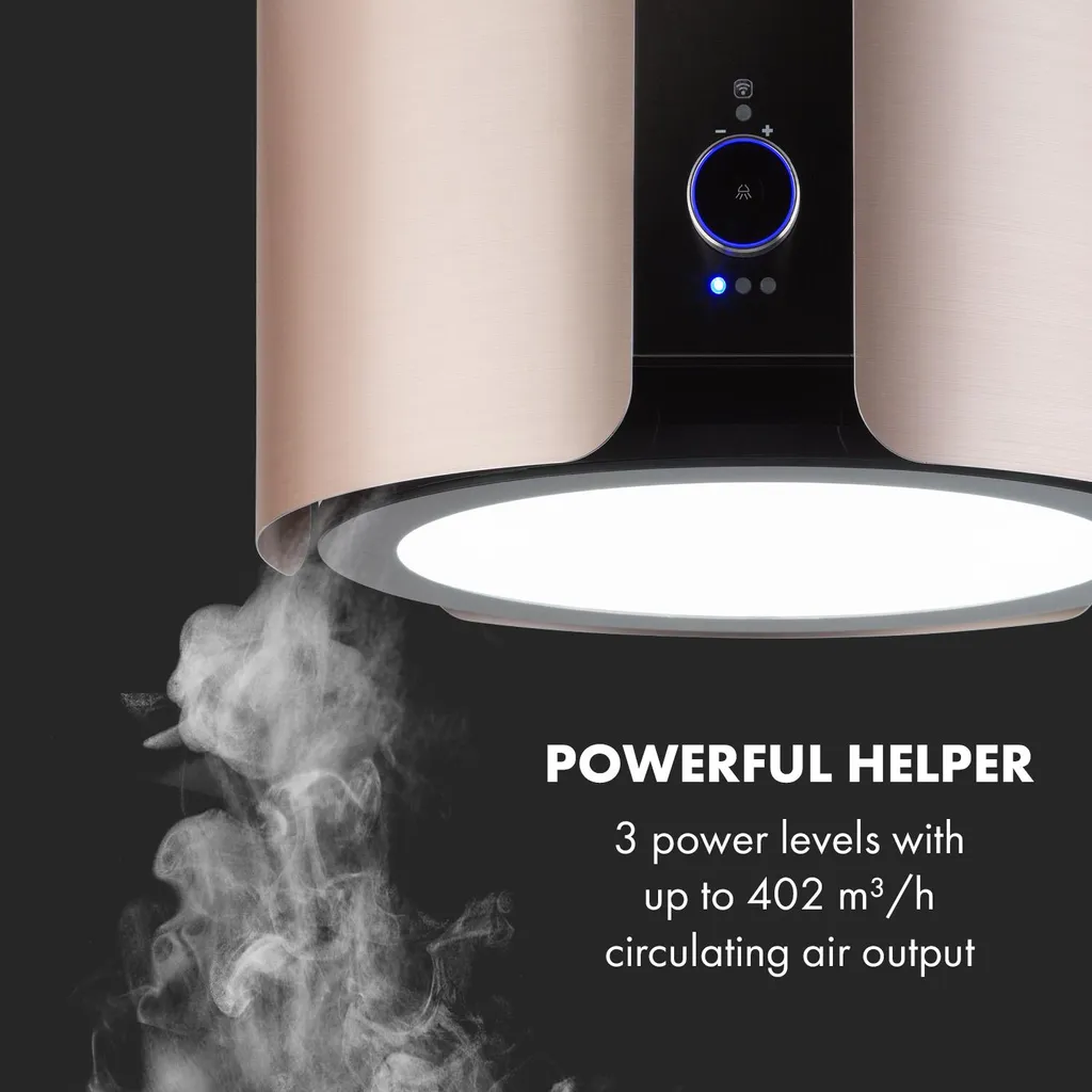 Klarstein Skyfall Smart Inselhaube,App- Und Gestensteuerung,45 X 42 Cm (ØxB),freihängend,Umluftbetrieb/Abluft,3 Stufen,402 M³/h,200 W,LED Beleuchtung,EEK C,inklusive Aluminium-Fettfilter Und 2 Aktivkohlefiltern,Wifi,illuminierter Touch-Drehregler,Dunstabzugshaube,Edelstahl,gold