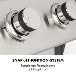 Grillen auf offener Flamme ohne Kohlestaub und Fummelei beim Anzünden? Mit dem Klarstein Lucifer 2.0-T Gasgrill ganz einfach. Dank SNAP-JET-Ignition-System mit integrierter Piezozündung werden einer oder beide Brenner per Knopfdruck entzündet. Der Grill abreitet dank Gasbrennern mit dem InstantReady Concept das heißt, er ist sofort einsatzbereit, ohne lange auf das Durchglühen der Kohle oder Aufheizen der Grillplatte warten zu müssen. Beide Brenner sorgen jeweils mit 3,5 kW Heizleistung für Grillhitze unter dem gusseisernen Grillrost. Der bietet sich mit 45 x 44 cm Fläche für verschiedenstes Grillgut an: herzhafte Steaks, knackige Würste, leckeres Grillgemüse oder saftiger Fisch. Die große Grillplatte aus emailliertem Gusseisen sorgt für eine gleichmäßige Verteilung der Hitze, sodass auch in Randlagen der Grillzone alles schön kross gebraten wird. Mit der großen, doppelwandigen Edelstahl-Haube sind auch Spezialitäten des passiven Grillens wie Pulled Pork oder SpareRibs kein Problem. Das integrierte Thermometer erleichtert dabei die Temperaturüberwachung. Ist der Grill zu heiß oder zu kalt, wird einfach an den stufenlosen Drehschaltern nachjustiert. Für viel Platz beim Grillen sorgen die beiden Seitentische aus Edelstahl, die nach Belieben ein- oder ausgeklappt werden – perfekt für Balkone mit kleinem Platzangebot. Jeder Seitentisch stellt 32,5 x 45,5 cm Abstellfläche zur Verfügung – genug für Schüsseln, Pfannen, Besteck, Getränke oder Gewürze. Haben wir an alles für Ihr perfektes Grillerlebnis gedacht? Na klar, denn der Lucifer 2.0-T besitzt auch noch einen integrierten Flaschenöffner für die schnelle Erfrischung, vier Haken zum Aufhängen von Grillzange, Spießen oder Pfannenwendern, einen emailierten Warmhalterost für fertiges Grillgut und ein Gewürzregal für Pfeffer, Salz, Öl, Dressing und was Sie sonst noch brauchen – hier ist einfach alles am Grill und alles zur Hand!