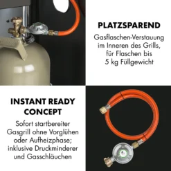 - Betriebsfertig: inklusive Druckminderer und Schlauch (Gasflasche nicht enthalten)