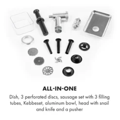 Mit 600 Watt Arbeitspower dreht der Kupfermotor unseres Klarstein Mett Max Fleischwolfs die Schnecke und das daran befindliche Edelstahlmesser in unermüdlicher Geschwindigkeit. So werden die zugeführten Fleischstücke zerkleinert und durch eine von drei Lochscheiben – 3 / 7 mm oder Triangel – gepresst. Heraus kommt frisches Hack, das Sie zu Bulletten, frischen Mettbrötchen, als leckere Füllung in Krautroulladen uvm. weiterverarbeiten können. Oder Sie nutzen die große Aluminiumschale, um fertig gewürzte Fleischstücke mit Hilfe des Wurstaufsatzes mit 3 Füllrohrstärken in selbstgemachte Würste zu füllen. Egal ob Leber- oder Bratwurst, hier bestimmen Sie, was in den Darm kommt. Damit ist der Funktionsumfang des Klarstein Mett Max Fleischwolfs noch nicht erschöpft: Mit dem Kebbeaufsatz lassen sich die leckeren, gefüllten Bulgurklöße ohne viel Aufwand zubereiten. Und bleibt doch einmal ein Fleischstück in der Schnecke stecken, wird es entweder per Rücklauf oder mit extrem starken 2000 Watt Blockierleistung wieder gelöst.