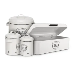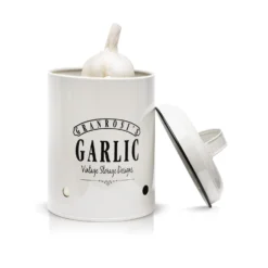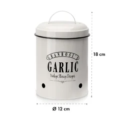 Der platzsparende Emaille-Knoblauchtopf Montana von Klarstein im Vintage-Design der 40er Jahre mit der Aufschrift “GARLIC” ist nicht nur sehr stabil und groß genug für die Knoblauchlagerung von ca. 1,2 kg, sondern auch ein absoluter Blickfang in jeder Küche. Was oft vergessen wird: Knoblauch ist vor allem dann lange haltbar, wenn er dunkel und bei leichter Luftzirkulation gelagert wird. Durch die kleinen Lüftungslöcher im Knoblauchbehälter wird die Keimbildung verhindert und die Knoblauch-Zwiebel bleibt länger frisch. Die Aufbewahrungsbox kann selbstverständlich auch für die Lagerung von anderem Gemüse verwendet werden und lässt sich schnell und einfach mit einem feuchten Tuch reinigen. Mit einem Durchmesser von 12 cm und einer Höhe von 18 cm passt diese Knoblauchaufbewahrung im Landhaus-Stil bequem auf dein Sideboard, deine Küchenzeile oder in den Küchenschrank. Das stabile rostfreie Emaille-Stahlblech ist sehr robust und kann – anders als Steingut oder Porzellanbehälter – den ein oder anderen unabsichtlichen Sturz überstehen.