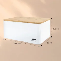 Praktisch und schick! Die große Metall-Brotbox Oklahoma mit Schneidebrett im trendigen Look von Klarstein ist nicht nur sehr stabil und groß genug für die gleichzeitige Lagerung von mehreren Broten und Backwaren, sondern auch ein absoluter Hingucker in der Küche. Dank der Lüftungslöcher auf der hinteren Seite des Brotbehälters ist für die wichtige Luftzirkulation gesorgt. Das vermindert Feuchtigkeit im Inneren und hält dein Brot lange knusprig und frisch! Der praktische und robuste Deckel aus Bambus kann darüber hinaus auch als Schneidebrett verwendet werden. Mit Maßen von 35,5 x 15,5 x 23 cm (BxHxT) passt dieser Brotspeicher bequem auf dein Sideboard, deine Küchenzeile oder in den geräumigen Küchenschrank.