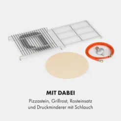 Dank einer Befeuerung mit Gas lässt sich der Pizzaiolo Neo Pizzaofen von Klarstein ganz ohne Stromanschluss im Kreis von Freunden und Familie draußen im Grünen nutzen. Die Bedienung ist sehr einfach: Du schließt die Gasflasche an den Ofen an und entzündest mit Hilfe des im Bedienknopf integrierten Zünders die Flamme. Die Temperatur hast du durch ein eingebautes Thermometer jederzeit im Blick, während das Gehäuse aus Edelstahl für eine schnelle Hitzeverteilung sorgt. Der Pizzaiolo Neo ist dank glatter Oberflächen und hochwertiger Materialien schnell und einfach zu reinigen und ermöglicht eine langlebige Nutzung. Der 33 cm große Pizzastein ist vor allem für Pizzen, Flammkuchen und Backwaren geeignet. Der Grillrost ist hingegen für leckeres und perfekt zubereitetes Fleisch und Gemüse zuständig. Ein Abtropfblech kümmert sich dabei um herabfallende Krümel und Fettreste und hält den Korpus zuverlässig sauber. Für einen sicheren Stand sorgen vier robuste Füße.