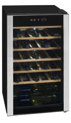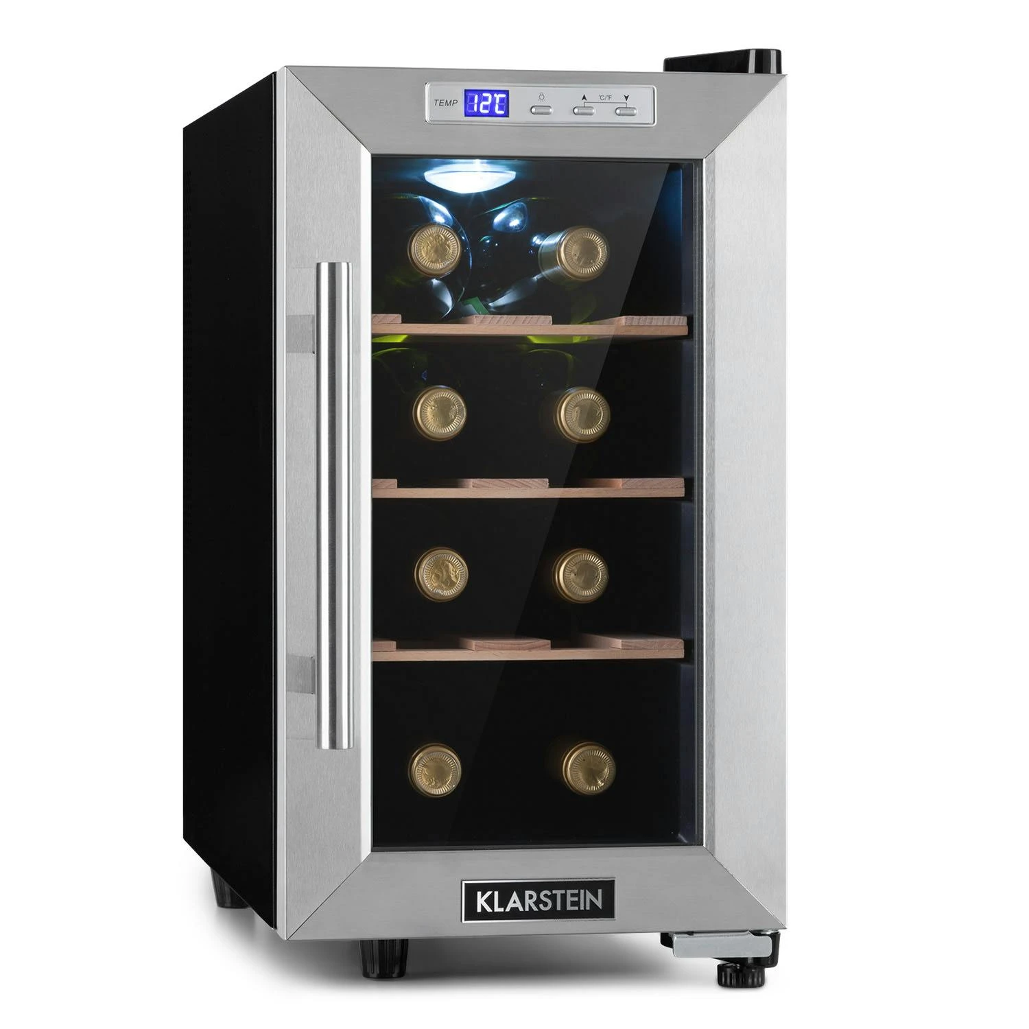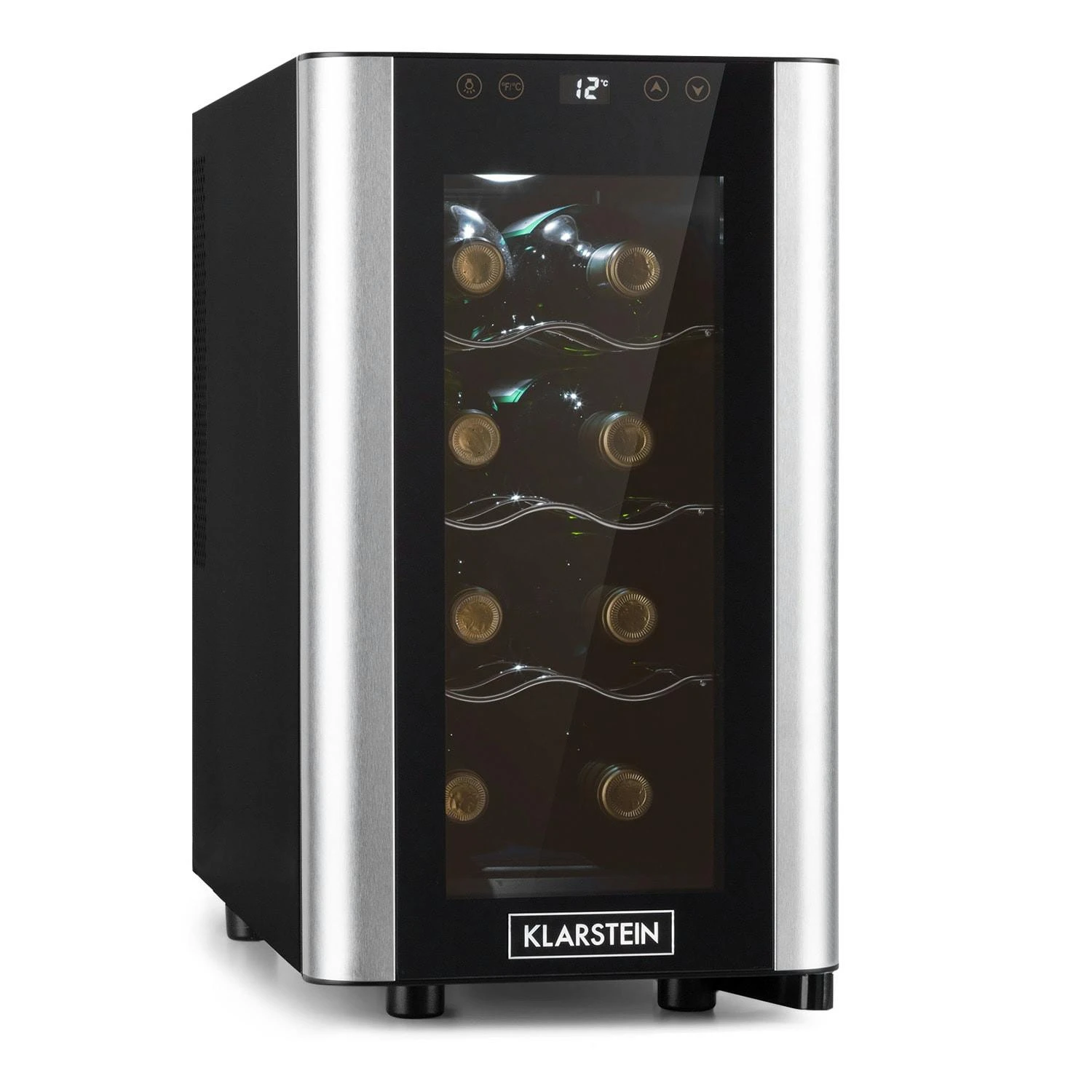Der Klarstein Reserva 8 Slim Uno Weinlagerschrank hält in seiner 23 Liter großen Kühlzone bis zu 8 Flaschen Genuss bereit. Vier Lagerebenen mit drei herausziehbaren Metallböden sowie eine zuschaltbare LED-Innenbeleuchtung sorgen für eine stilechte Präsentation. Mit Hilfe des Touch-Bedienfeldes und dem LC-Display an der Türaußenseite lässt sich die Temperatur individuell und bequem auf einen Wert zwischen 11 und 18 °C einstellen.