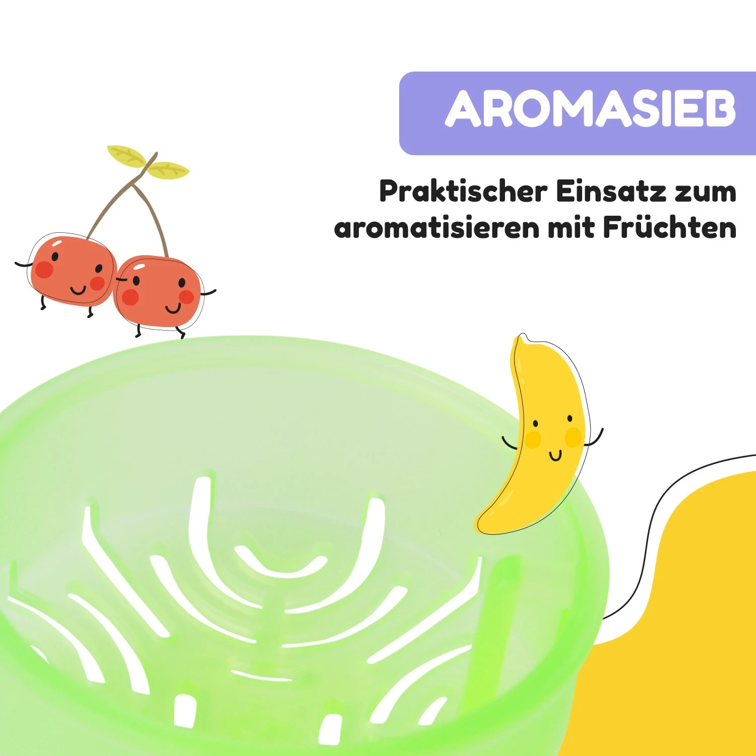 Durch die Herstellung aus BPA-freiem Tritan ist diese Trinkflasche perfekt als Wasserflasche geeignet, denn das Material ist geschmacksneutral und absolut gesundheitsunbedenklich für dich oder deine Kinder. Ein feines Extra: durch den Fruchtaufsatz kannst du das Wasser mit köstlichen Früchten versüßen. Das Fruchtfleisch bleibt beim Trinken in der Flasche und entfaltet so im Wasser ein feines Aroma.