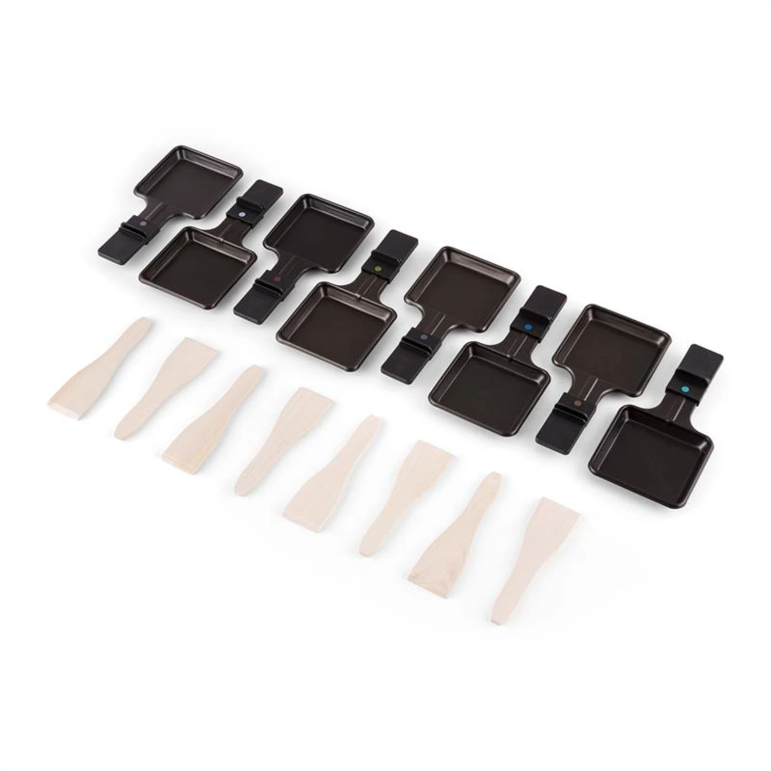 Auch in der Ausstattung überzeugt der Klarstein Tenderloin Raclette-Grill. 2 x 600 W Leistung bringen die Heizschlangen zum Glühen. Die erhitzen zum Einen die acht antihaft-beschichteten Pfännchen und zum Anderen die Naturstein- und die Metallgrillplatte. Erstere ist aus poliertem Granit und besitzt eine eingefräste Rinne zum Abführen von Bratfett. Die Metallplatte ist aus antihaftbeschichtetem Aluminiumdruckguss und besitzt Hitzerippen um Fleisch ein leckeres Bratgewand zu verschaffen. Zu jedem Pfännchen gehört außerdem ein Holzspatel, mit dem geschmolzener Käse bewegt oder Grillgut auf den Platte gewendet werden kann, ohne Kratzer in den Oberflächen zu verursachen.