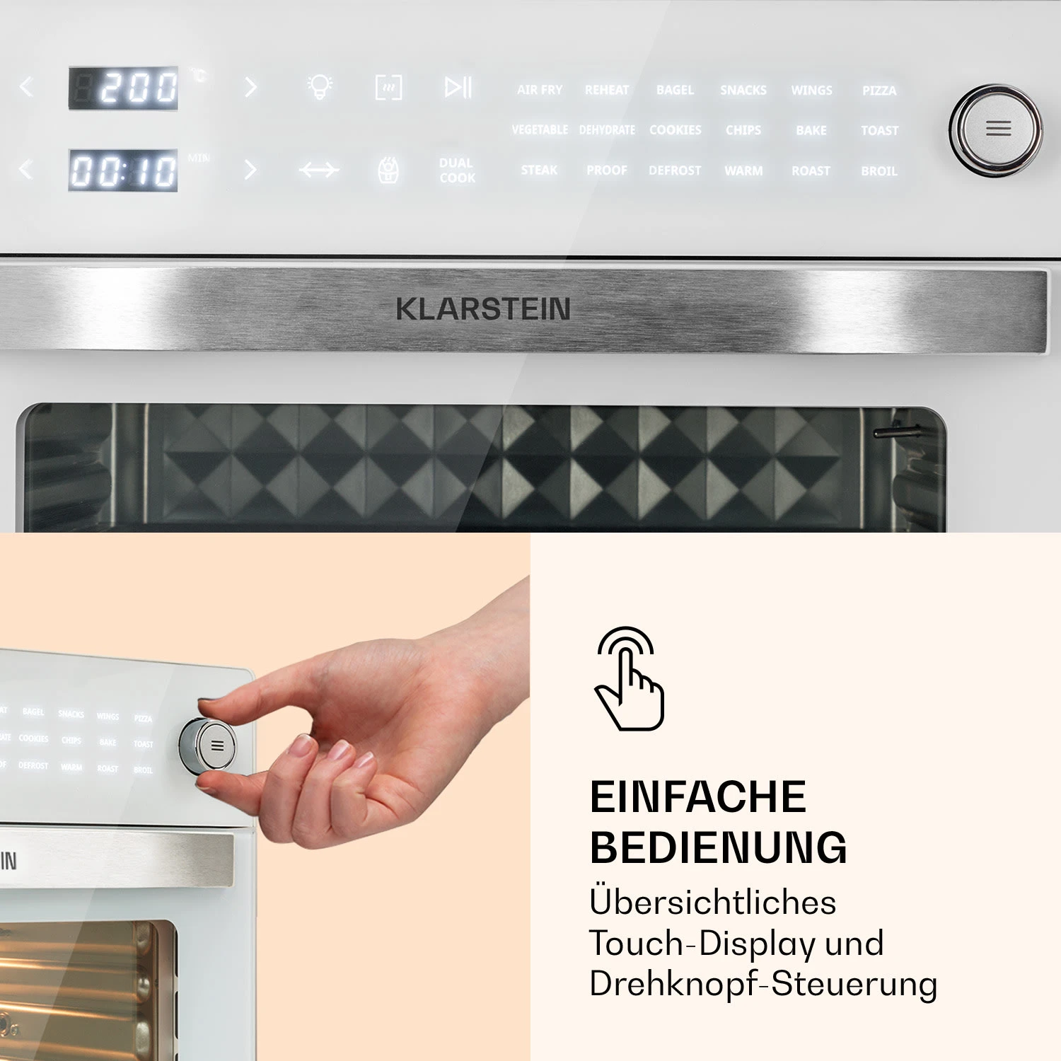 Frittieren, Backen, Grillen oder Rösten – all diese Funktionen sind dank der zwei Heizelemente (Ober-und Unterhitze) für den Vigor Air kein Problem. Mit 18 vorsteingestellten Programmen und einem übersichtlichen Touch-Panel kommst du ganz einfach und bequem in den Genuss zahlreicher leckerer Speisen. Dank einem Volumen von 30 Litern ist das ansehnliche Gerät sehr geräumig und eignet sich besonders für Familien oder große Haushalte. Spezielle Funktionen wie das Duale Kochen sowie ein umfangreiches Zubehörset lassen dabei keine Wünsche offen.